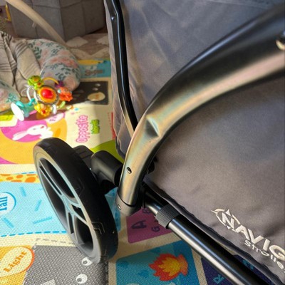 A: Hello! The Navigator® 2-in-1 Stroller Wagon is equipped with Large 8" and front 11" rear wheels that allow you to navigate smoothly through outdoor environments. You can also go from Stroller "push" mode to maneuver effortlessly through gritty landscapes such as sand. If you have additional questions, please reach out to our customer service team at 1-800-328-7363 available Monday through Friday 8 AM to 4:30 PM PST and we will kindly assist you.