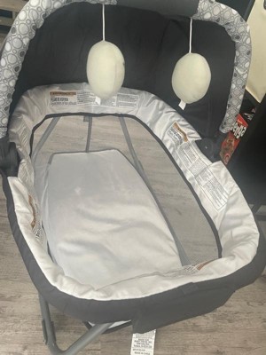 - Cradle comes with canopy, plush fabric and mesh sides for proper ventilation, and two plush hanging toys to encourage grasping and reaching