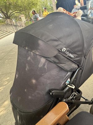 [This review was collected as part of a promotion.] This is a great stroller and both my baby and toddler love it! The material is nice and I like that there is a tray to hold snacks and water. It is a smooth ride and the sub shade works well. It would be nice if the material were a lighter color--black gets hot!