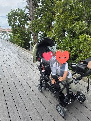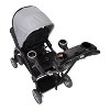 - Children can sit in the front and rear seats of this stroller or stand on the rear platform