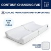 Designed for exceptional comfort, this babyGap by Delta Children Contoured Changing Pad with Cooling Cover features gently curved edges, a non-slip bottom and safety strap with quick release buckle to keep your baby securely in place. The included cover keeps your child’s changing environment cool, dry, and comfortable with its cooling fiber construction. For your convenience, the cover is machine washable and the inner vinyl layer on the changing pad is waterproof which can be easily wiped clean with a damp cloth. Fits most standard changing tables and dressers.