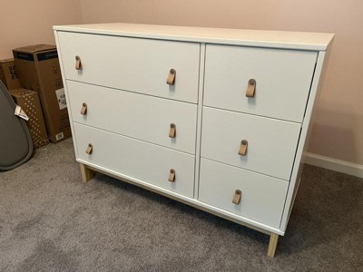 I absolutely love this dresser! All the parts feel really good quality, including the lacquer coating, which doesn’t seem like it will scratch easily, and the leather pulls that are thick and feel like they’ll hold up well. The drawer slides all aligned perfectly. The assembly took about 3 hours, but I am 35 weeks pregnant, so I consider that an accomplishment. Note that as a safety feature, you can only open one drawer at a time. The drawers don’t go all the way to the back, but it’s still pretty spacious and holds a lot. I also found that for the longer drawers, it’s best to pull with both hands rather than single-handed. I wish the soft close function was a little smoother. I love this dresser and am so glad I bought it!