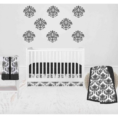 This Bacati 6-piece Crib Set Includes Reversible Comforter/Playmat (33 x 43 inches), Crib fitted sheet (52 x 28 x 6 inches), Crib Skirt/Dust ruffle (13 inch drop) Diaper Stacker (holds more than 30 newborn diapers), Reversible Long Crib Rail Guard Cover (52 x 12 inches) and Window Valance (15 h x 56 w inches with 1.75 inch Rod Pocket) in fun, colorful and signature prints in 100 percent cotton 200 Thread Count percale fabrics. Designed in United States by Experienced Designers. Many coordinating items available to purchase separately in this Bacati Classic Damask Black/Grey/White Bedding Collection.