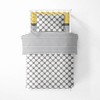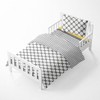 - This Bacati 4-piece Toddler Bedding Set Set Includes Reversible Oversize Comforter (42 x 55 inches), Toddler Bed Fitted Sheet(52 x 28 x 6 inches), Toddler Bed Flat Sheet(52 x 42 inches) which is fitted at the bottom to make the bed easily and Standard Pillow Case (20 x 25 inches) with french ties on the back in fun, colorful and signature prints in 100 percent cotton 200 Thread Count percale fabrics. Designed in United States by Experienced Designers. Many coordinating items available to purchase separately in this Bacati Dots Stripes Gray Yellow Bedding Collection.