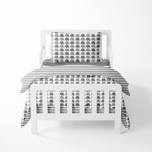 - This Bacati 4-piece Toddler Bedding Set Set Includes Reversible Oversize Comforter (42 x 55 inches), Toddler Bed Fitted Sheet(52 x 28 x 6 inches), Toddler Bed Flat Sheet(52 x 42 inches) which is fitted at the bottom to make the bed easily and Standard Pillow Case (20 x 25 inches) with french ties on the back in fun, colorful and signature prints in 100 percent cotton 200 Thread Count percale fabrics. Designed in United States by Experienced Designers. Many coordinating items available to purchase separately in this Bacati Elephants White Gray Bedding Collection.