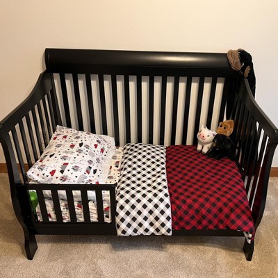- This Bacati 5-piece Toddler Bedding Set Set Includes Reversible Oversize Comforter (42 x 55 inches), Toddler Bed Fitted Sheet(52 x 28 x 6 inches), Toddler Bed Flat Sheet(52 x 42 inches) which is fitted at the bottom to make the bed easily and Standard Pillow Case (20 x 25 inches) with french ties on the back as well as Decorative Pillow 12 x 16 inches in fun, colorful and signature prints in 100 percent cotton 200 Thread Count percale. fabrics. Designed in United States by Experienced Designers. Many coordinating items available to purchase separately in this Bacati Lumberjack Red Black Bedding Collection.