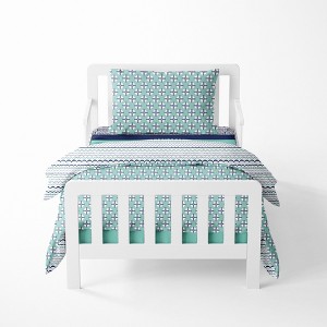 - This Bacati 4-piece Toddler Bedding Set Set Includes Reversible Oversize Comforter (42 x 55 inches), Toddler Bed Fitted Sheet(52 x 28 x 6 inches), Toddler Bed Flat Sheet(52 x 42 inches) which is fitted at the bottom to make the bed easily and Standard Pillow Case (20 x 25 inches) with french ties on the back in fun, colorful and signature prints in 100 percent cotton 200 Thread Count percale fabrics. Designed in United States by Experienced Designers. Many coordinating items available to purchase separately in this Bacati Tribal Print Noah Mint Navy Bedding Collection.