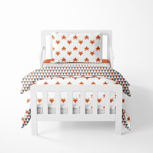 - This Bacati 4-piece Toddler Bedding Set Set Includes Reversible Oversize Comforter (42 x 55 inches), Toddler Bed Fitted Sheet(52 x 28 x 6 inches), Toddler Bed Flat Sheet(52 x 42 inches) which is fitted at the bottom to make the bed easily and Standard Pillow Case (20 x 25 inches) with french ties on the back in fun, colorful and signature prints in 100 percent cotton 200 Thread Count percale fabrics. Designed in United States by Experienced Designers. Many coordinating items available to purchase separately in this Bacati Playful Fox Orange Gray Bedding Collection.