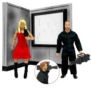 The set features a 6.5-inch tall female ring announcer figure and a 7-inch tall TV cameraman figure, both detailed and ready to document all the action.