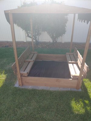perfect size, easy to put together, like the seats that convert to a cover. used pea gravel instead of sand.
