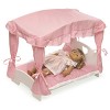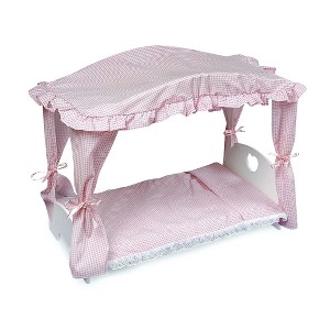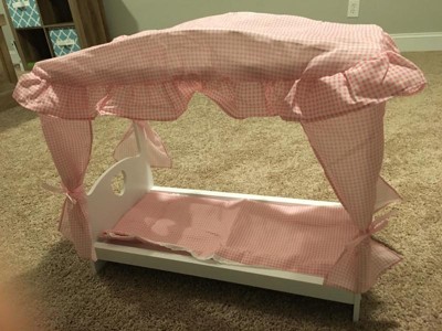 Badger Basket's Canopy Doll Bed with Bedding is fancy toy furniture fit for a queen! Dolls, and special stuffed animals, will slumber in comfort thanks to the padded mat with attached pillow. Classically arched canopy is trimmed with a sweet ruffle and tied around the posts with silky, pink ribbons. For children ages three and up and dolls up to 20 inches. Made with MDF and fabric. Wipe, spot clean, and hand wash as needed. Overall assembled dimensions: 22 inches L x 11.75 inches W x 20 inches H. Adult assembly required.