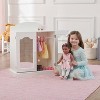 Badger Basket's Mirrored Doll Armoire with 3 Baskets and 3 Hangers is a safe and organized closet for your most treasured doll accessories! Includes three hangers for special dresses, costumes, and outfits. Three removable baskets for organizing small treasures. For children ages three and up and dolls up to 24 inches. Made with wood, MDF, and fabric. Wipe and spot clean as needed. Overall assembled dimensions: 23.5 inches L x 11.5 inches W x 27.5 inches H. Adult assembly required.