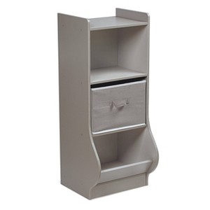 Badger Basket's Upright Storage Nook is perfect for organizing small spaces. With a small footprint, it allows for maximum storage in minimum space. Perfect for storing small toys, books, stuffed animals, and puzzles; the Upright Storage Nook is ideal for kid’s rooms, playrooms, and even family rooms. Have more space? Line up 2 or 3 Storage Nooks together to create a custom storage solution that is perfect for your family. Includes one removable and reversible storage basket, two shelves, and one angled bin. Solid panel construction ensures that your treasured items stay inside the unit – nothing falls out the back or sides. Smooth surfaces are easy to clean and maintain. Made with laminated wood, melamine finish. Metal hardware. Basket made with non-woven fabric and have internal cardboard support panels. Overall dimensions are 15.5 inches wide x 15.75 inches deep x 37.75 inches high (12 inches deep at the bottom). Shelf areas each: 14.25 inches wide x 10.5 inches deep x 11.25 inches high. Basket: 13.75 inches wide x 11 inches deep x 9.75 inches high. Bottom bin – interior width and height: 14.25 inches wide x 13 inches deep (15 inches deep at top of angled ledge) x 11 inches high. Bottom bin opening measures 14 inches wide by 7 inches high. Assembled weight is 25 pounds. All measurements approximate. Wipe clean with a lightly dampened cloth and mild detergent as needed and dry thoroughly. Spot clean the baskets as needed with cold water and mild detergent and allow to air dry (never immerse in water). Adult assembly required. Illustrated assembly instructions included. Non-toxic. Product complies with all currently applicable safety standards and CARB ATCM standards. Product may vary slightly from shown and described. Props/accessories shown are for illustration purposes only and are not included with the product. Actual color/finish may vary slightly from screen display. This item ships in its original carton that may include a product photo.