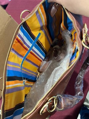 [This review was collected as part of a promotion.] The Badgley Mischka Madalyn weekend tote is absolutely stunning! The thick brown leather exterior is both durable and timelessly beautiful. This is the perfect size for a long day trip or weekend getaway. This would also be good as an everyday tote as well as it's not overly large. It has a large zippable pocket on the exterior. The interior is a colorful striped fabric with both open and zippable pockets. I love that it has multiple carrying options. There are shoulder straps, a cross body strap, and a trolly sleeve. The straps in proportion to the tote are well thought out and balanced, making it very comfortable to carry. My new favorite tote!