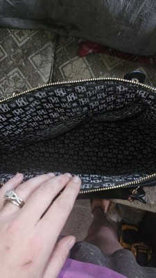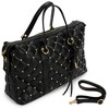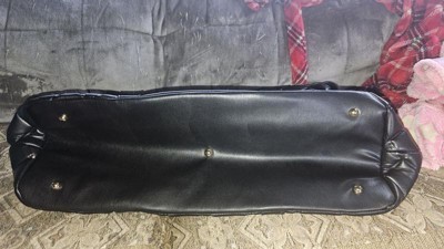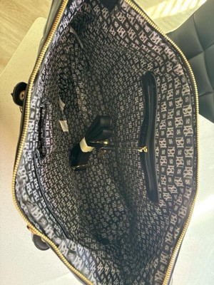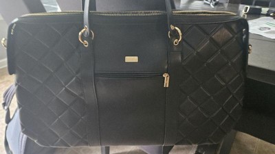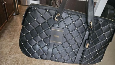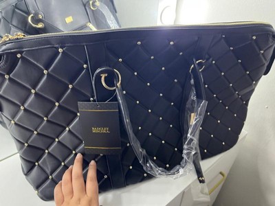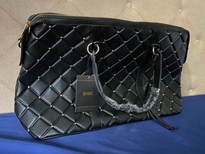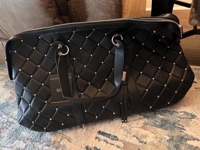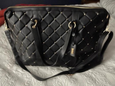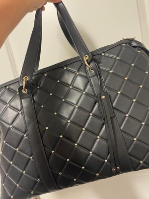 [This review was collected as part of a promotion.] This Badgley Mischka Quilted Ultra Microfiber Vegan Leather Travel Tote in black is an excellent choice for those who love to travel in style. This tote is medium-sized, very spacious, and lightweight, making it easy to carry around. The bag's material is comfortable and sturdy, ensuring it will last a long time. I really like the exterior all-over over-quilted patted texture and the one-sided decorative gold rivets that add a touch of glamour; I also like that it comes with hand and strap options, providing convenience and hands-free usage. I also appreciate the BM monogram inside lining and organized pockets, which allow easy access to all your travel essentials. Overall, this tote is an excellent investment for any fashion-forward traveler.