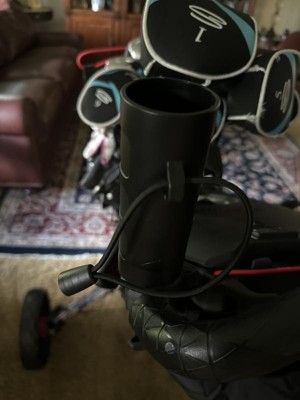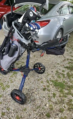 My son loved designing his own cart with picking out his colors. Cart works well, opens like advertised. could use a extra lever to lock in closed position. Only down fall is that the clubs lay back to far towards the handle, makes it almost impossible to use a sport bottle or large drink in the cup holder, unless you lower the handle down, which causes you to bent over more as you are pushing the cart. Make the bag sit more vertical and this cart will be perfect.