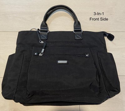 [This review was collected as part of a promotion.] I admit - I was a bit neurotic about choosing the right bag for my upcoming trip - so I bought 3 and analyzed each one. The competitors to the 3-In-1 Convertible bag were The Avenue Tote and the Any Day Tote. The 3-In-1 won hands down! I liked it because it felt like a regular handbag - not just a personal carry on. I liked the fact that there was no padded divider for the laptop - because that takes up unnecessary room - especially if you have a padded sleeve for the laptop. I loved all the pockets on the outside and inside. Of course the RFID blocking wristlet was a plus. I didn't love the short handles, because I prefer shoulder bags or cross body BUT this bag offers both those options as well. And most of all? I LOVED the fact that there is an additional pocket on the back, that doesn't interfere with the luggage sleeve. That means that you can slip your bag over your luggage handle and you still have access to a pocket to hold you passport or important papers. Having them in the front made me feel a bit exposed, and unable to protect them. Having the additional pocket on the back gave me a more secure feeling - and it was only on the 3-In-1 that it was available. Although the other two bags were slightly bigger in dimensions and might accommodate a bit more stuff inside, I felt there was a limit to what I was willing to carry - weight-wise so once again the 3-In-1 won. And the fact that I've used the same crossbody bag from Baggalini for the past several years - day in and day out - and it's still in great condition sold me on this company. I'm traveling next month and have a feeling that this will be my preferred bag for a long, long time.