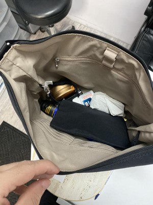 [This review was collected as part of a promotion.] Roomy bag and nice looking. I like the phone pocket - easy to access, and there are enough pockets to stay organized. it is roomy enough inside to hold a decent sized brush.