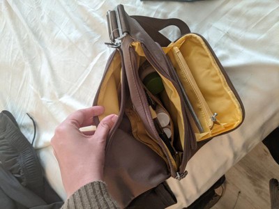 [This review was collected as part of a promotion.] I have used this bag now for a few weeks and freaky like it! My favorite part is the easy access to my phone. The open middle section is perfect, it is safely tucked away there but no zippers to open when I need it! Just enough pockets to separate my things, not too many either!