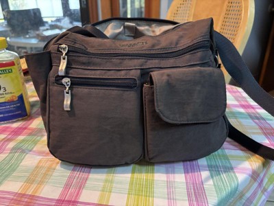I have a smaller gray Baggallini that I have taken to multiple countries and cities. I saw this bigger one online, and loved the water bottle holder and ability to slide it over a pull-on suitcase handle. I love all the pockets, wristlet and ability to even fit a jacket in it. I got a black cheetah color that is stylish, and matches my clothes better than the gray one I stumbled across at a TJMaxx 4 years ago. This new one satisfies all my travel needs, and knocking around at events in town. I use a smaller leather one for my regular purse, which looks more polished.