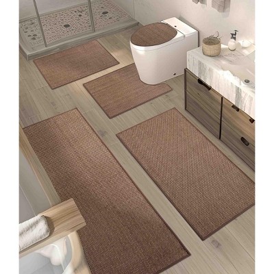 - Set includes a 18" x 26" mat, a 18" x 48" runner, and a U-shaped 20" x 24" contour rug—perfect for sinks, tubs, showers, and toilets. Each rug is made with advanced fiber-locking technology to resist shedding and is machine washable for easy care.