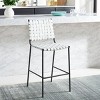 Introducing the Bahari woven counter stool, where elegance meets functionality. Adorn your space with the stool's sleek black metal frame and the intricate design of white woven leather. This stool is not just a seat, but an experience in itself. Its modern aesthetic, complemented by a classic monochrome palette, effortlessly enhances any decor. Crafted from leather and metal, the Bahari stool ensures comfort while maintaining a stylish presence. Whether placed at your kitchen counter or a casual bar setup, it establishes a tasteful ambiance. Choose the Bahari woven counter stool to make a statement and relish in a blend of sophistication and practicality. Elevate your living space with this perfect addition that seamlessly unites style with everyday utility.