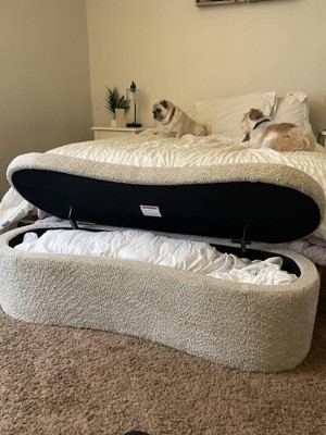 [This review was collected as part of a promotion.] I love this storage bench! It’s so cute. It’s already set up out of the box, you just have to throw the feet on. I chose not to put the feet on since I have it in front of my bed, and it’s currently the perfect height for my pups to get jump on to get on the bed on their own! They love to lay on it since it’s so soft and plush. I use it for storage for my blankets. It can fit a lot! I have a comforter and a few sets of sheets in it. The shape and material is unique compared to other storage benches I’ve seen, that’s why I love it so much! 10/10 recommend :)