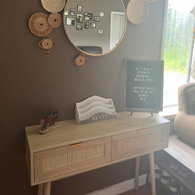 Add a retro inspired accent to your entryway with the stunning Baird console table. Made in China, the Baird is comprised of sturdy wood showcasing a light oak brown finish. Two drawers provide space to store keys and mail, while the wide tabletop offers room to display plants and decor. Requiring assembly, the console features woven rattan drawer faces and gold tone metal handles for eye catching style. A handy piece brimming with personality, the Baird console is sure to enhance any space.