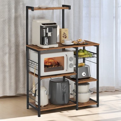Bakers Rack, Microwave Stand, Kitchen Storage Rack with Wire Basket, 6 Hooks, and Shelves