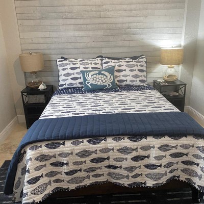 [This review was collected as part of a promotion.] This is such a beautiful quilt set. I love the beachy/coastal theme. It’s reversible and has a fish pattern on the front and a bold geometric pattern on the other side. I love both designs. The design is great for everyone of all ages. The quilt is well made and holds up after washing. It’s super soft and comfortable. I love the feel of a nice quilt like this one. It’s not too heavy or too light. The set comes with 2 matching shams and is a great way to make your bedroom look and feel more relaxing!
