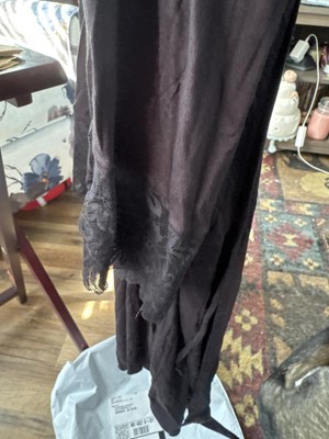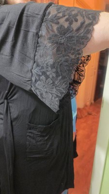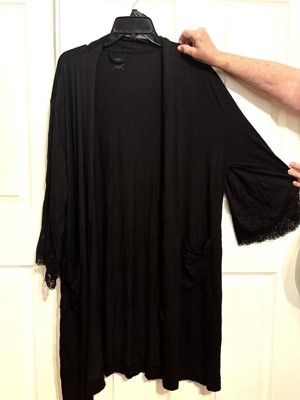 [This review was collected as part of a promotion.] This flattering robe is perfect for covering up during warmer weather. It’s thin and breathable, but the material also seems to be good quality and should hold up well. It’s soft and comfortable to wear, and the belt stays tied nicely. The lace sleeves add a nice touch of style!