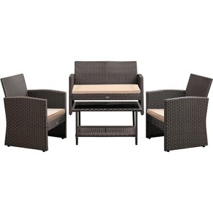 - BALKENE HOME 63742: The Ashville Wicker Patio Set in an attractive mocha/khaki colorway includes seating for four and a glass-topped coffee table. Outdoor-fabric upholstered cushions in classic khaki provide added comfort.