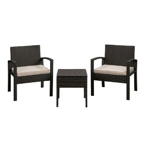 The Bern Wicker Conversation Set is constructed of all weather wicker and includes comfortable light khaki cushions. The lightweight yet durable armchairs and occasional table are perfect for enjoying an evening on the patio or relaxing poolside. The attractive mocha finish is the ideal accent for any patio. This wicker set can be used year-round and provides a maintenance-free outdoor seating experience.