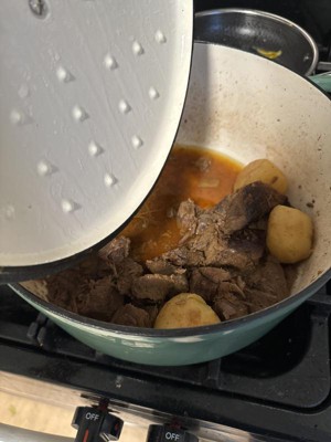 Looking for a perfect size pot for our growing family's Sunday dinner and I found it! The 7.5 quarts is perfect for gumbo! I love cooking in cast iron because it heats evenly and browns the chicken and andouille. This pot has such a cool lid design...little dimples create a rain forest ... the outcome is incredible flavors. The design is so beautiful too from the copper-colored metal knob and the beautiful red exterior. My favorite feature is serving in it on the table. The cast iron keeps it hot for a really long time.