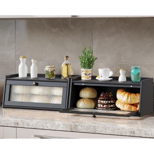 This is a combination of practical and safe bread box, the selection of high-quality bamboo wood production, high hardness, strong and durable, natural environmental protection, non-toxic and tasteless, so that you are safer, healthier and more assured to use it. The overall surface has been carefully polished, smooth and flat, not solid, more convenient to clean. Magnetic opening and closing cabinet door, effectively prevent dust and moisture, so that the food stays dry at the same time, but also convenient for you to take at any time. The cabinet doors are embedded with corrugated acrylic panels, allowing you to see what you are storing while covering up the clutter, creating a neat and cozy home atmosphere. One cabinet is multi-purpose, store food on the lower shelf, place spices or decorations on the top shelf, a box that transforms into different types of organizers as you wish, for greater space saving.