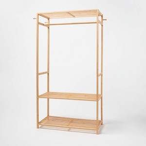 Keep your closets or entryway spaces stylish and organized with this Bamboo Garment Rack with Shelving from Brightroom™. Made from bamboo for a sophisticated, natural look, this garment rack has two shelves and a top rack, each with a 40-pound capacity — perfect for storing jackets, clothes or accessories in any room. Once assembled, this rack brings simplicity to your wardrobe organization.
