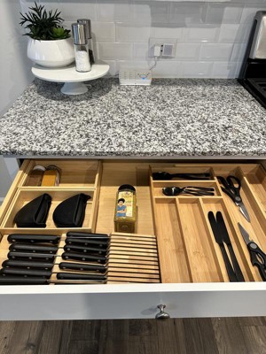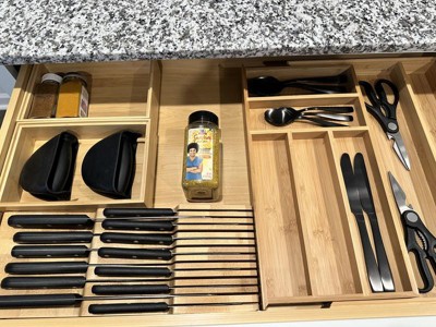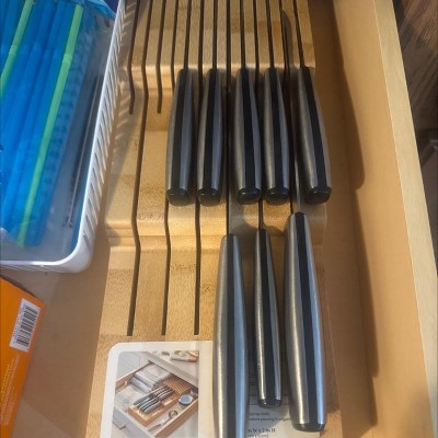 Organize knives drawer with bamboo knife holder. Fits well, protects knives. Perfect for kitchen storage.