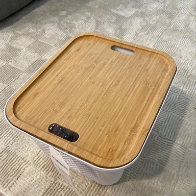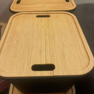 A: The bamboo lid has a rectangular silhouette, designed to fit neatly on storage bins.