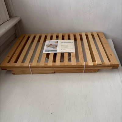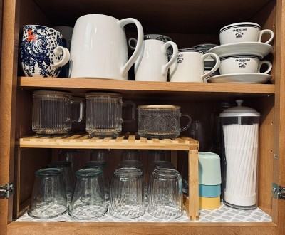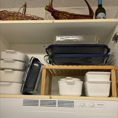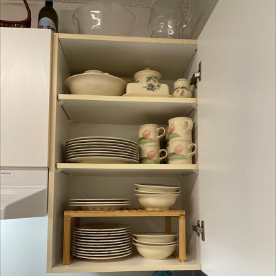 A: Hello Jo – This Bamboo Stackable Helper Shelf Brown is sure to help organize your kitchen, or any space. The weight limit of the shelf is 10 lbs. We hope this helps! - Ryan