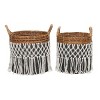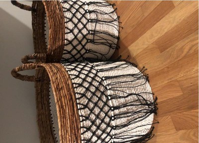 - These boho-themed baskets are woven with faux banana leaf ropes extending into 2 side handles