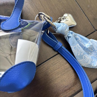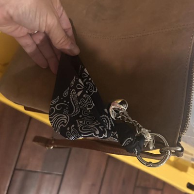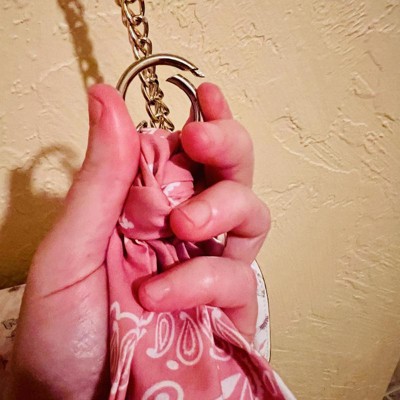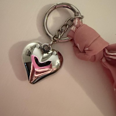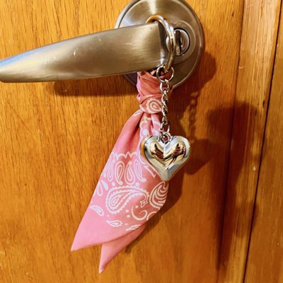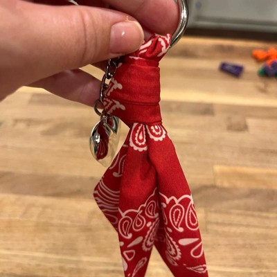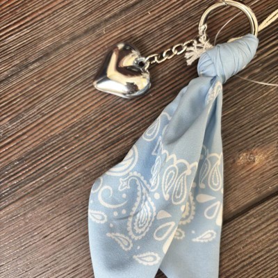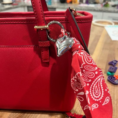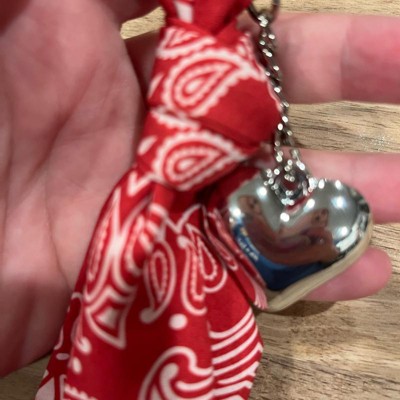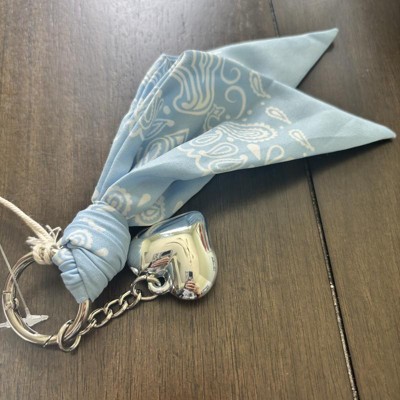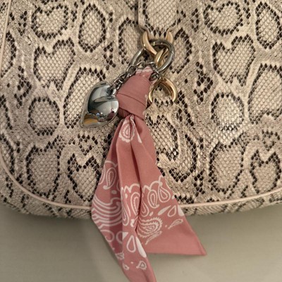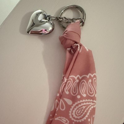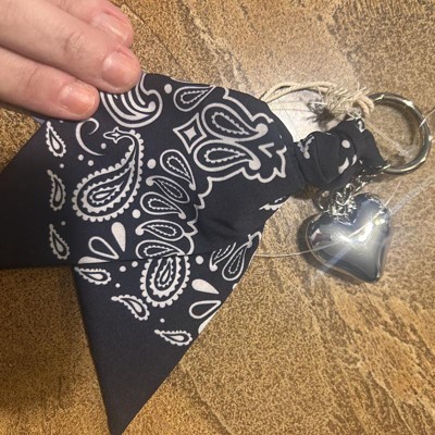 A: The bag charm features a stylish bandana and a heart charm for a fashionable look.