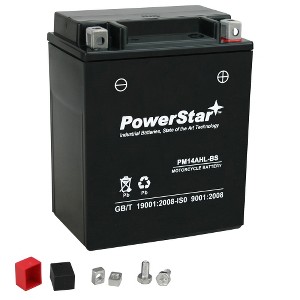 The Powerstar PM14AHL-BS is a 12 Volt 14Ah 210CCA battery, and fits a variety of motorcycles, scooters, snowmobiles, and personal watercrafts!ItsSealed Lead Acid (SLA) and Absorbent Glass Mat (AGM) design guarantees you an incredible leak, shock, vibration, and heat resistance.Need a reliable start every time? The PowerStar YTX14AHL-BS battery delivers high cold cranking amps (CCA) and exceptional starting performance, ensuring you're always ready to hit the road.This PowerStar boasts a high-capacity design that provides extended usage time. Experience the freedom of longer rides without worrying about frequent recharges.See the full specifications & the makes and models this battery fits below!30 DAY MONEY BACK GUARANTEESPECIFICATIONS =Voltage 12 VCapacity 14 Ah @10Hr RateCold Cranking Amps 210 CCATerminal Type Nut & BoltDimensions L=5.28" x W= 3.54" x H= 6.54"Weight 10.42 lbs (4.73 kg)Seamless Replacement for Part Numbers=Yuasa YTX14AHL-BS, 12N14-3A, 12V14L-B, 14AHL-BS, 44005, BTX14AHL-BS, CB14L-A2, CB14L-B2, CTX14AHL (FA), CTX14AHL-BS, CYTX14AHL-BS, EBX14AHL-BS, ETX15L, EXT15L, FAYTX14AHL, FB14L-A2, GT14L-BS, GTX14AHL-12B, GTX14AHL-BS, LTX14AHL-BS, M62H4L, M72H4L, MB YB14L-A2 (S), PTX14AHL-BS, PTX14AHLBS-FS, SC14AHLFA, Sears 44005, TX14AHL, UTX14AHL, UTX14AHL-BS, X2-15L, XTA14AHL-BS, YB14L-A2, YB14L-B2, YTX14AHL, YTX14L-2, YUAM62H4L...and more!APPLICATIONS=ATVs, Motorcycles, Scooters, Personal Watercrafts (PWC), UTVs,anywhere 12V 14Ah batteries are needed!