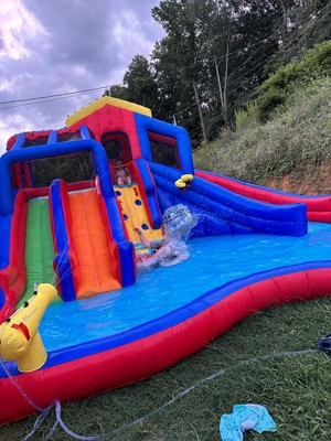 [This review was collected as part of a promotion.] First off, this thing is big. A lot of advertisers seem to make the pictures seem bigger than reality but this thing really is that big. There are a ton of fun things for kids to do with this playscape. It is HEAVY so be warned that it can not be moved easily, but that's expected given the size. The blower that comes with it is plenty powerful without being crazy loud. Setup was also pretty straightforward and it's easier to run the water lines once it is blown up.