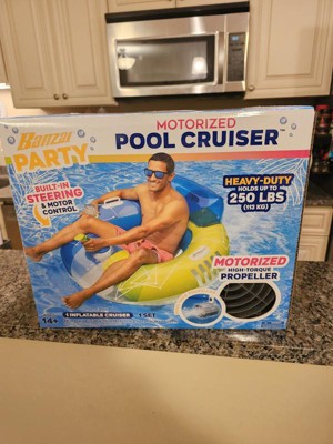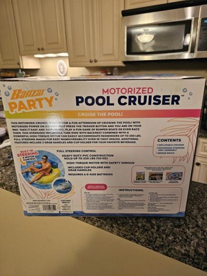 The Banzai motorized pool cruiser is a high quality, fun addition to your pool toys. It comes with a powerful high-torque motor, full functional built-in steering, and motor control is ideal for cruising around the water; Recommended for ages 14 years and up. High-quality PVC construction provides increased durability for use on the water season after season. The Comfy oversized inflatable bumper tube ring with backrest ensures maximum comfort and supports up to 250 pounds Features: Features a built-in cupholder, pool-safe propeller with a safety shroud for added protection, and integrated grab handles for effortless entry and exit