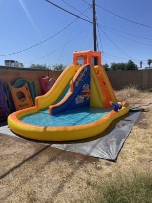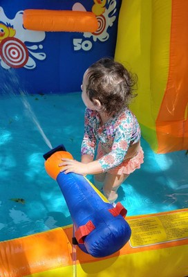 - COMPLETE KIT: This splash park has a waterslide, climbing wall, duck-blasting game, inflatable duck floater, mesh wall, and water cannon. It comes with anchor stakes, an air blower, and a storage bag