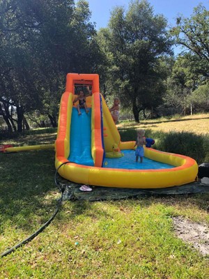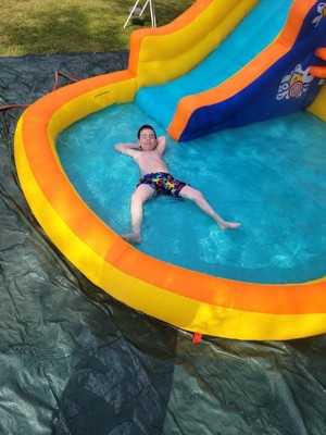 [This review was collected as part of a promotion.] My kids love this! There is so much to do on this. My kids love climbing the climbing wall to the top to the slide. They made the top there fort to relax away from the water. But when they want to get wet again the slide down into the pool area. There is a bit of an argument with the inflatable riding duck and the water shooter because they both seem to want to do the one the other is doing. They love shooting the ducks. This keeps my kids busy for a long time and for extra fun we put water balloons in there and they are just in heaven!! It is easy to inflate and to connect the hose.