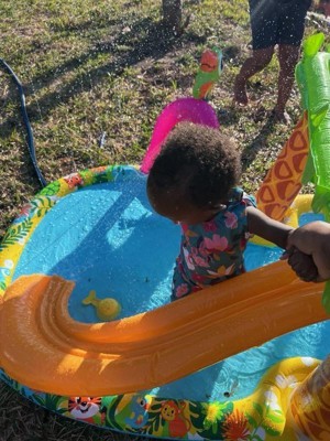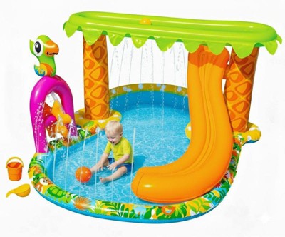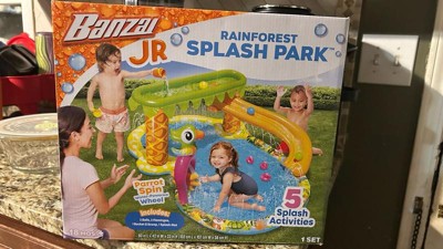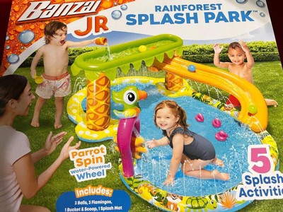 [This review was collected as part of a promotion.] Banzai Jr Rainforest Splash Park is a great toy for small kids, especially if you have small space in your home. It includes 5 splash activities and accessories to play with it. It’s suggested for kids 18 months + It easily attaches to a water hose which includes a water splitter hose connector. It has a 60inch L x 42inch W x 23inch H dimensions. This splash park is made with resistant materials and has everything in the picture, you just need to inflate it and done!!