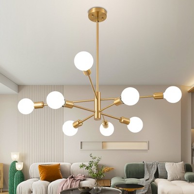 Specifications: Dimensions: 23.62" Diameter x 24.8" Height Number of Lights: 9 Bulb Requirements: 9 x E12 Candelabra Base (Max 40W each, bulbs not included) Materials: Gold Metal Frame, Handcrafted Cloud Glass Shades Dimmable: Yes (with compatible dimmable bulbs and dimmer switch) Voltage: 110V Included: All Mounting Hardware & Instructions