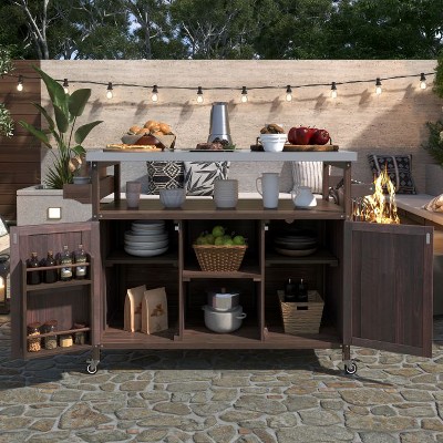 BAOURE Outdoor Kitchen Island with Stainless Steel Top, Farmhouse Solid Wood Grill Table with Spice Rack & Lockable Wheels - Dark Brown