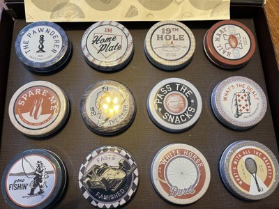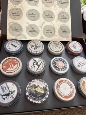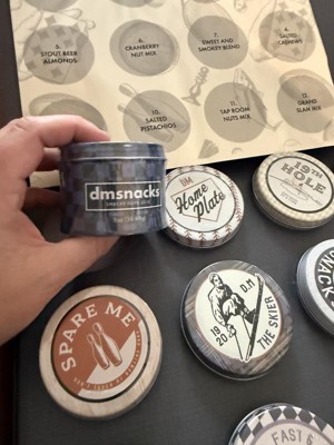 I am so impressed with the quality of these snacks! There is a great variety (sweet, salty, and simple) and the all metal canisters are really nice, with easy to use screw tops. All of the nuts are fresh and no one skimped on the seasoning. I actually think the concept, "snacks for men who like sports" is both funny and on-point, depending on who I would give these to. I'm already reusing the canisters--they're a perfect size for other snacks and, not to be stereotypical, nails and screws.